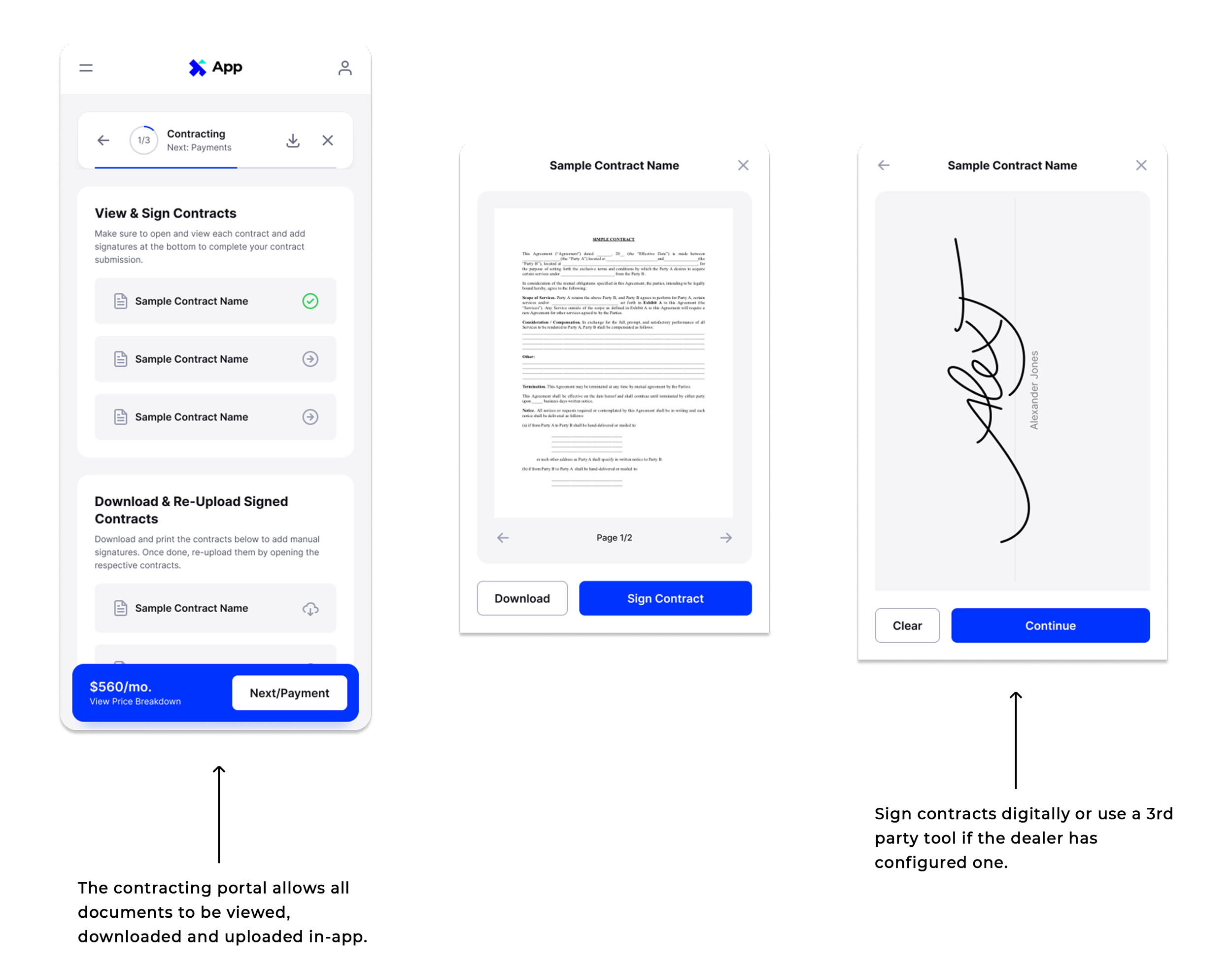 State-of-the-art contracting tool that lets buyers view, download and upload contracts and sign them digitally. Our platform allows for 3rd-party integrations for popular e-Sign tools like DocuSign that dealers can configure at their end, and lets buyers sign digitally in-app as well.