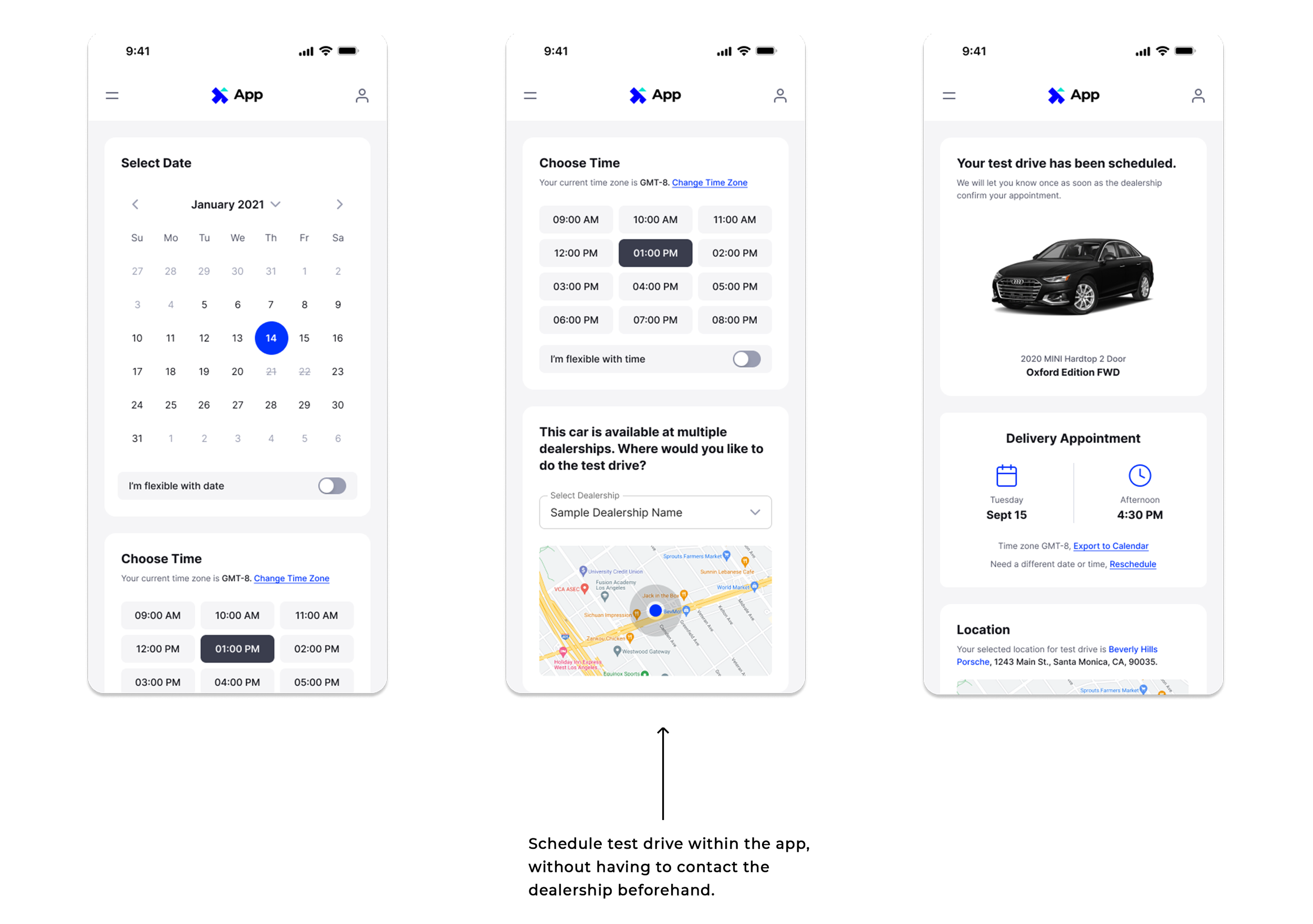 Convenience: Our research showed that test drives are a crucial part of the car-buying process, with 70-80% of buyers testing their drives before purchasing. However most retailing tools book test drive sessions offline, with most buyers having to set up appointments over the phone. Our app keeps test drive schedules for each available vehicle and lets the user schedule an appointment in-app.
