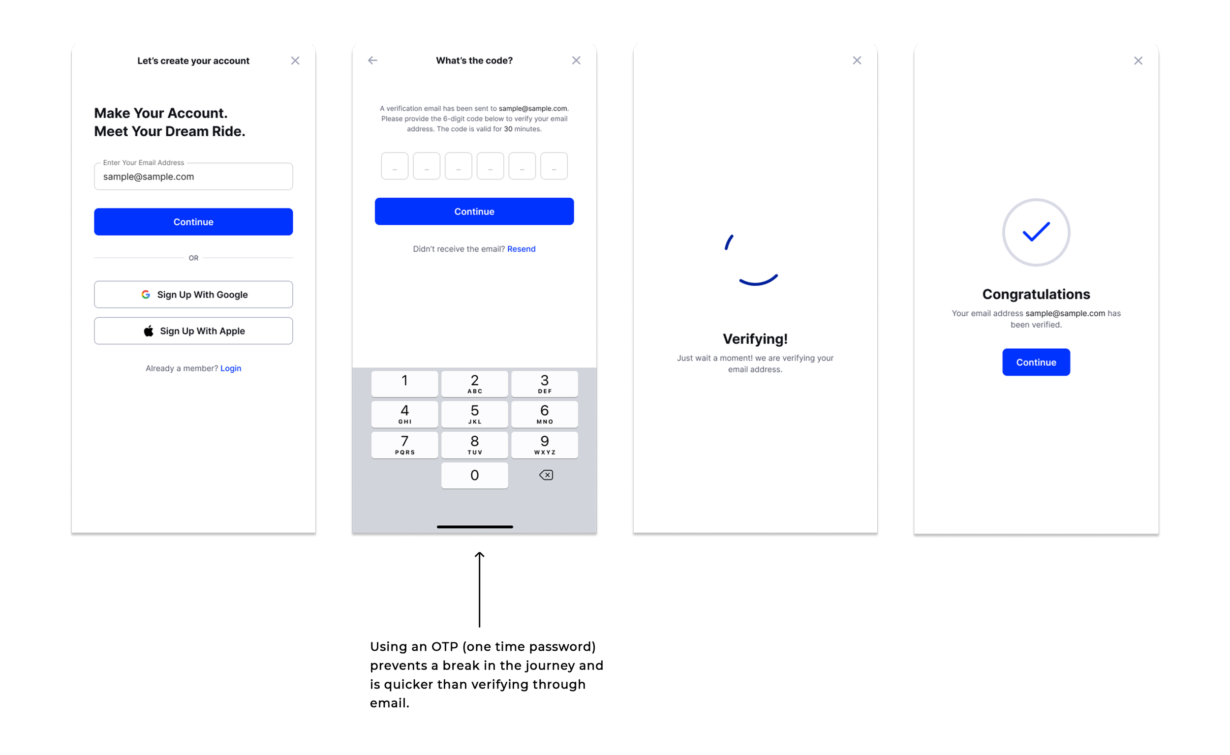 Faster: Using an OTP (one time password) takes seconds to verify a user, where they can opt to use their phone number or email for OTP verification.