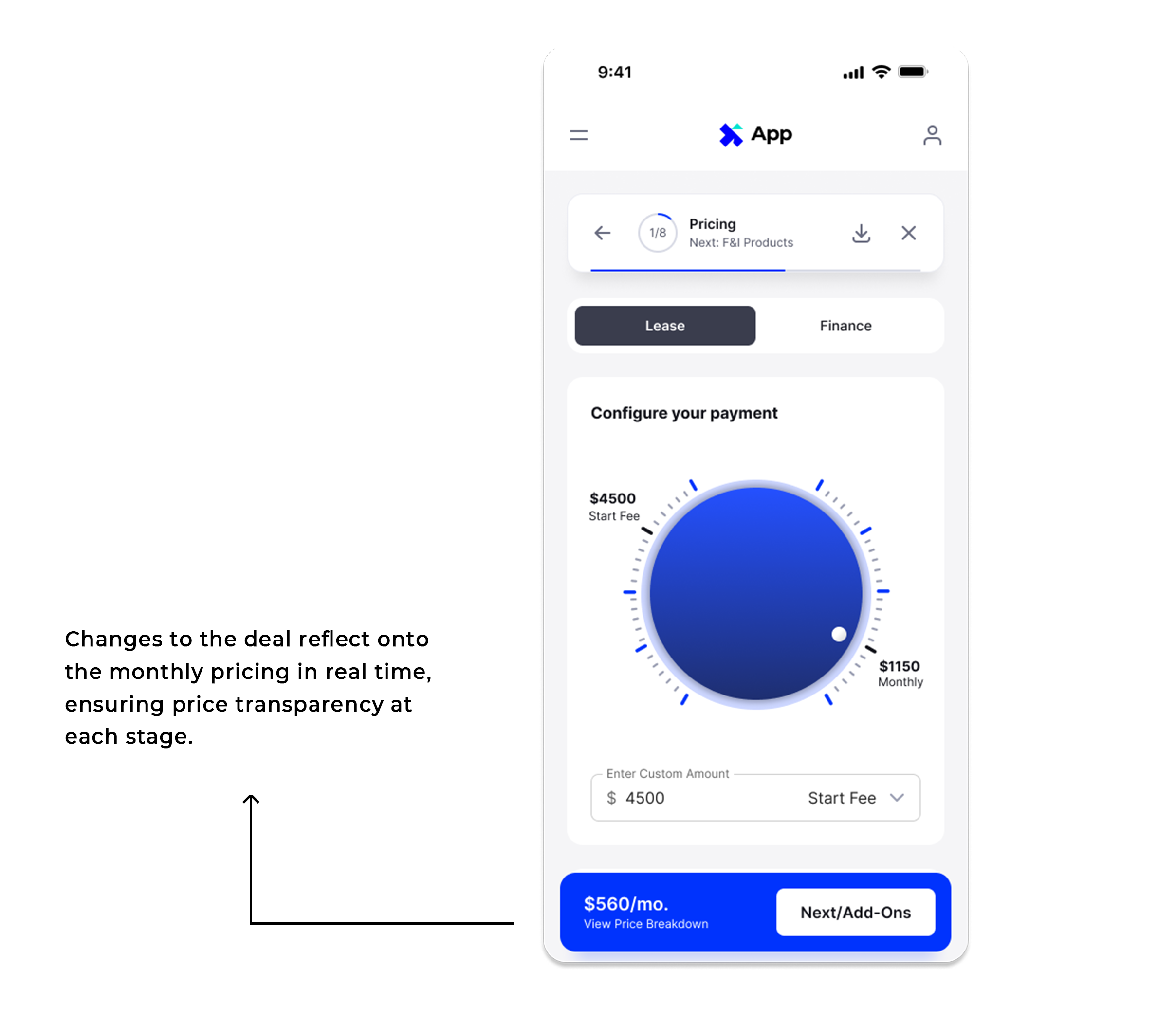 Pricing Transparency: Changes to the deal (down payment, mileage, add-ons etc.) reflect onto the monthly pricing shown in the footer in real time, will full price breakdown accessible at all times.