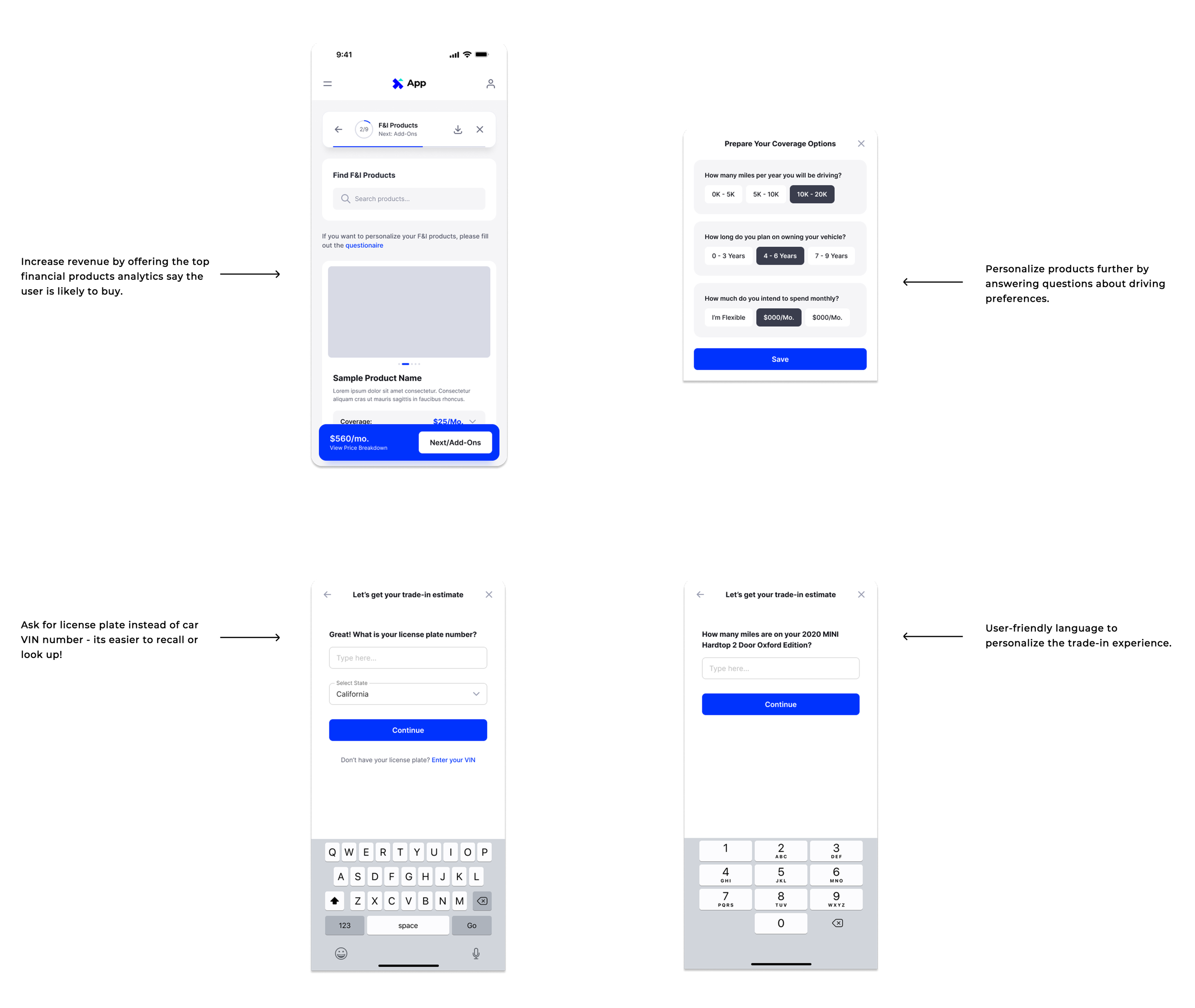 We designed for analytics being used at every product offering during the journey, and added optional questionnaires if users feel like giving more details about their preferences. The copy is extremely important in making a personable experience and we made sure to use user-friendly language when asking for inputs. For example, when entering car details for trade-in, we asked “How many miles have you driven on your vehicle?” instead of “Enter mileage”. Our research found that though subtle, these changes can have a compounded effect on user perception.