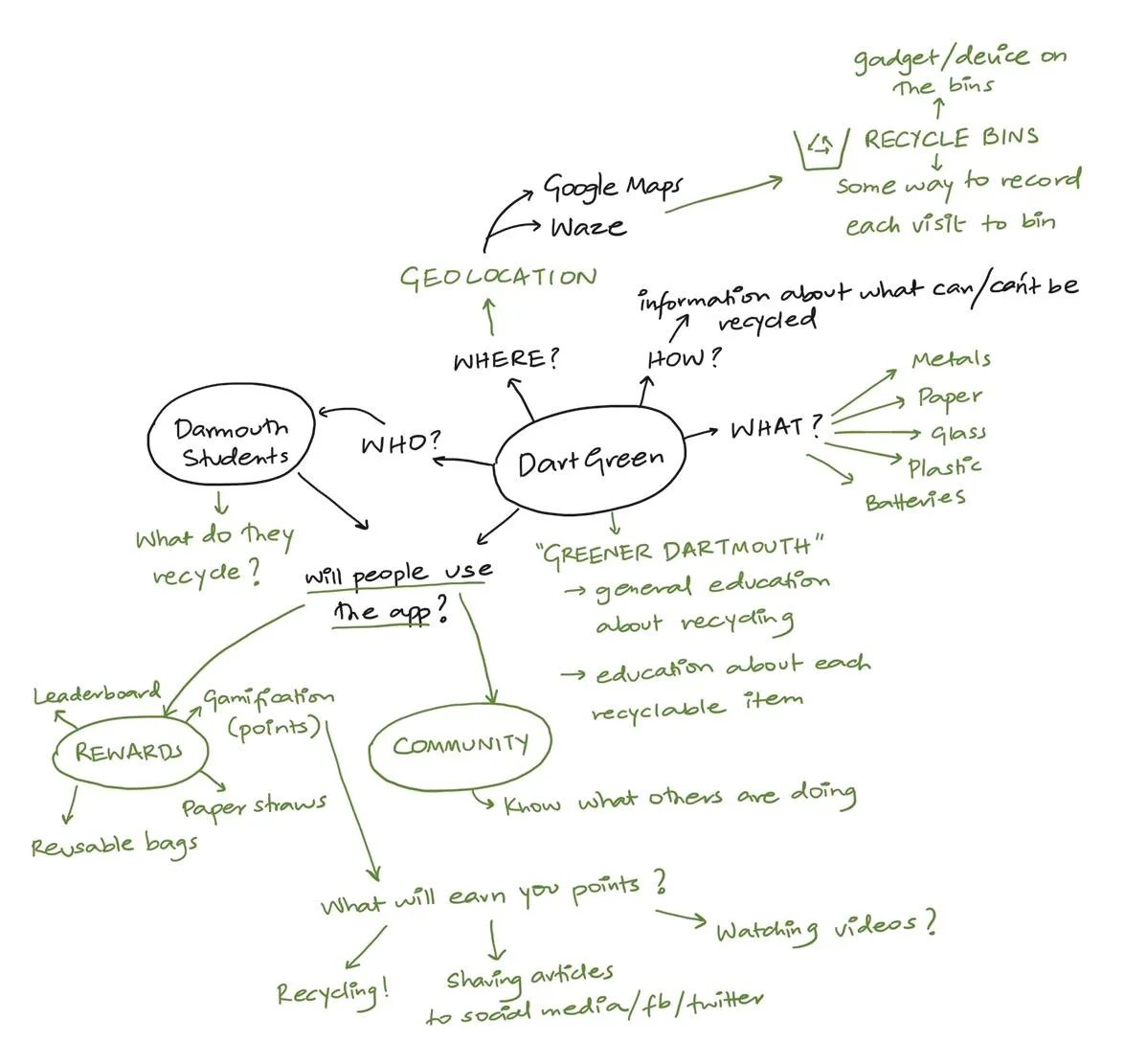 The app would have information about recyclable materials, including Dartmouth specific items (bottles, food containers etc). The information would be constantly updated to accommodate new items on campus.