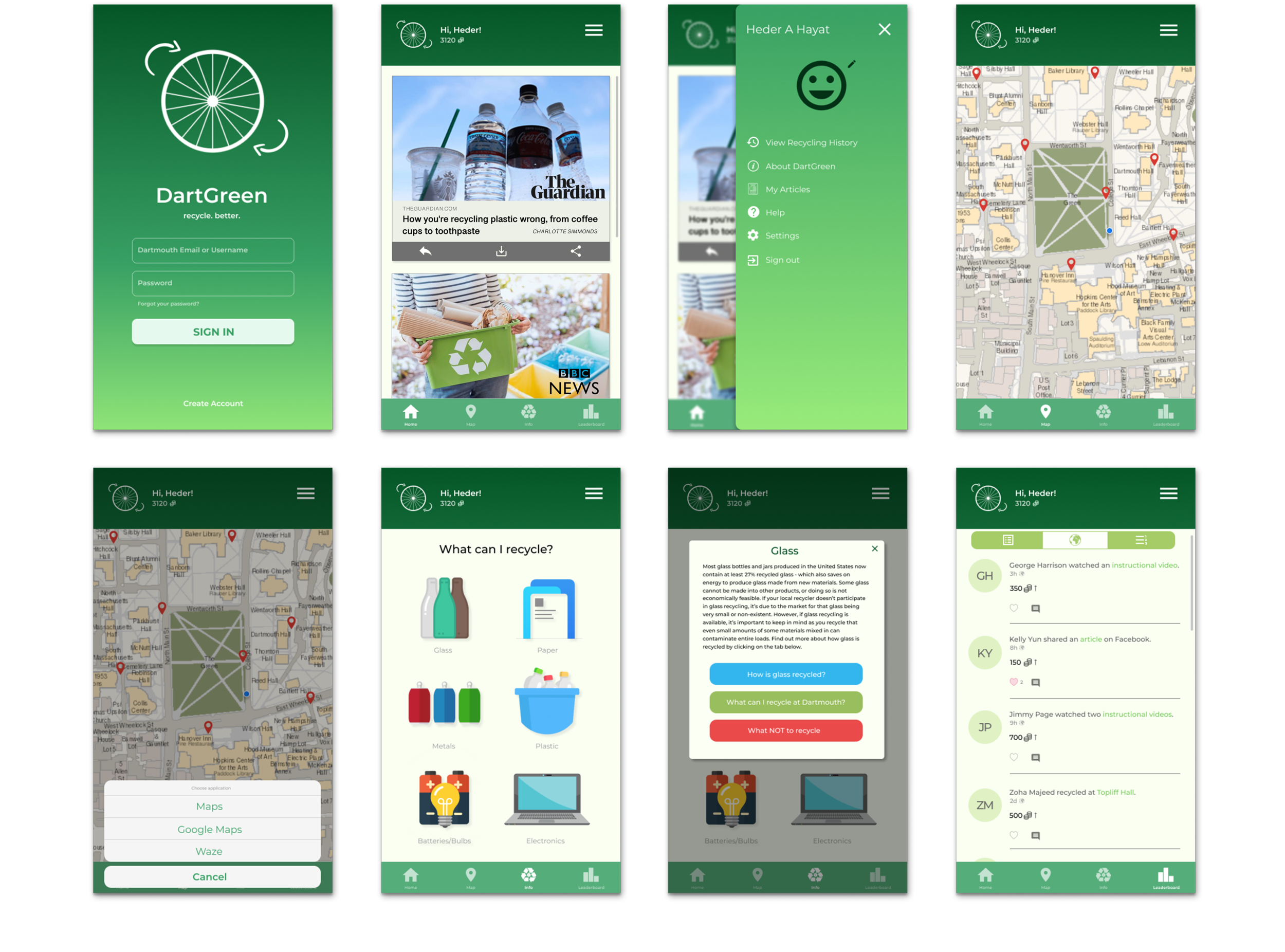 DartGreen is a mobile app prototype that promotes and encourages the practice of recycling on our college campus. Studies have shown that a majority of college students in the US donāt recycle their waste items and many donāt know what items ought to be recycled.