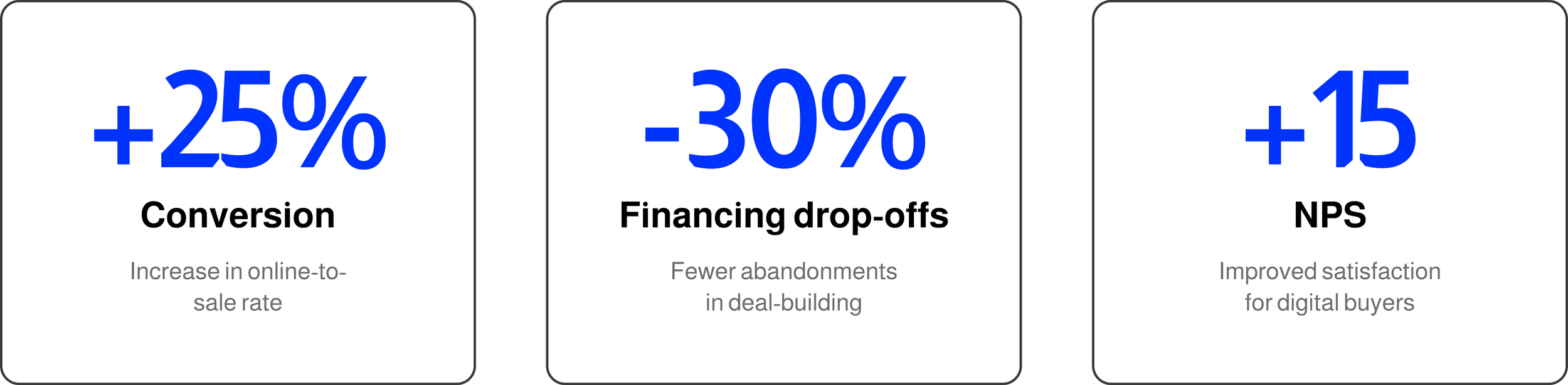 Online-to-sale conversion: ~25% increase compared to existing digital buying flows, driven by reduced friction and clearer deal configuration.