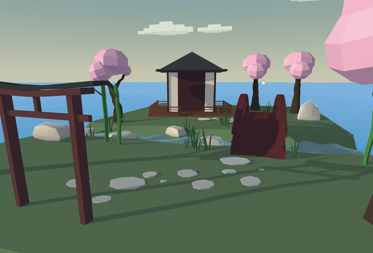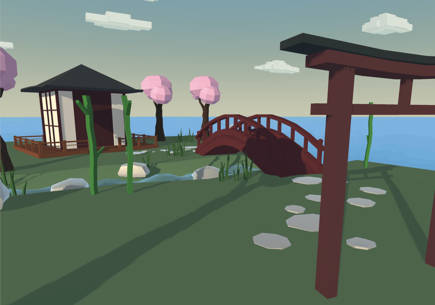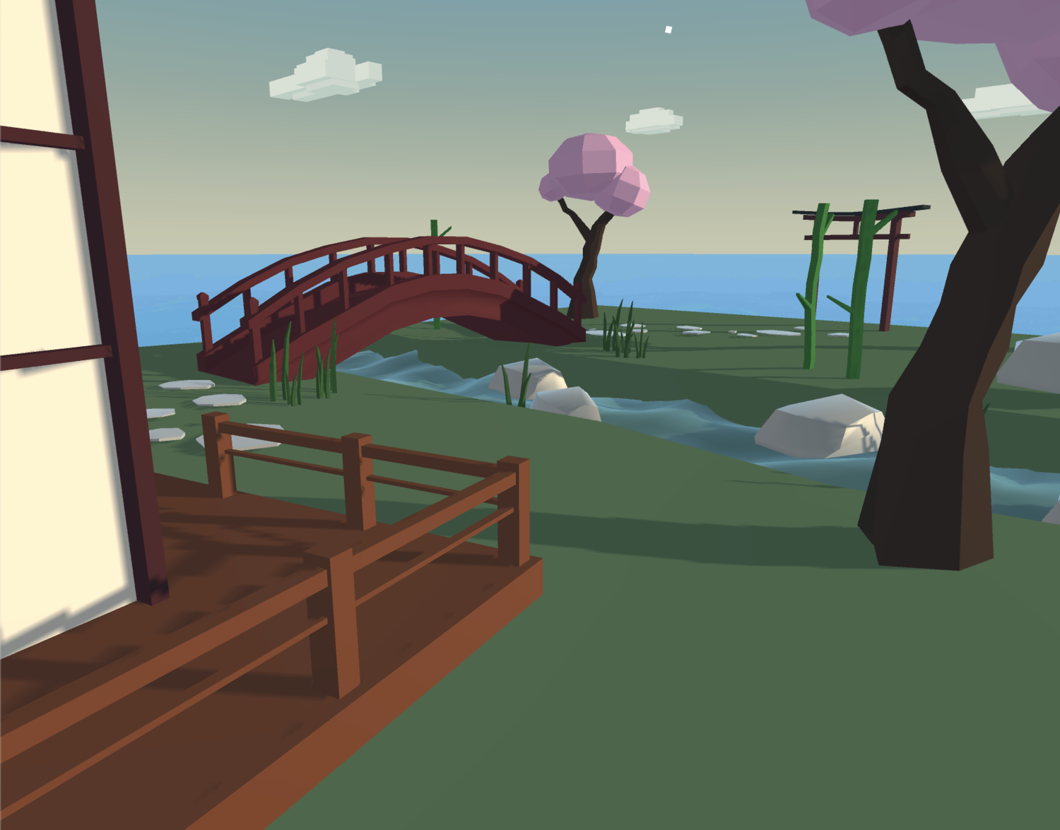 The setting of the application is a Japanese river garden. We also decided on adding other structures to the environment, such as a house and a bridge. All models are low-poly; as a result we were able to apply a minimal aesthetic to our scene and also rid our VR experience of any load times or lags.