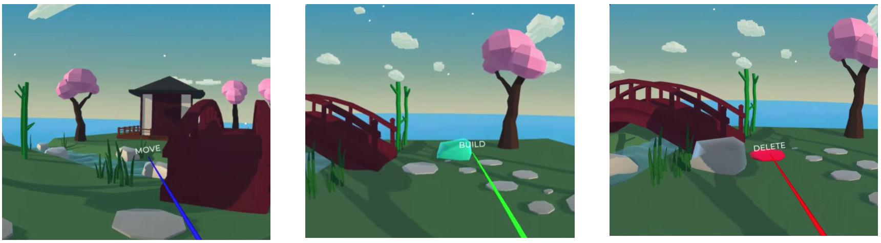 The user can create/delete assets, make them bigger or smaller and move them around to a location of their choosing and in doing so, they can create their own version of the scene. We believe that this is a calming and fun experience for the user to be creative and build out their virtual worlds.